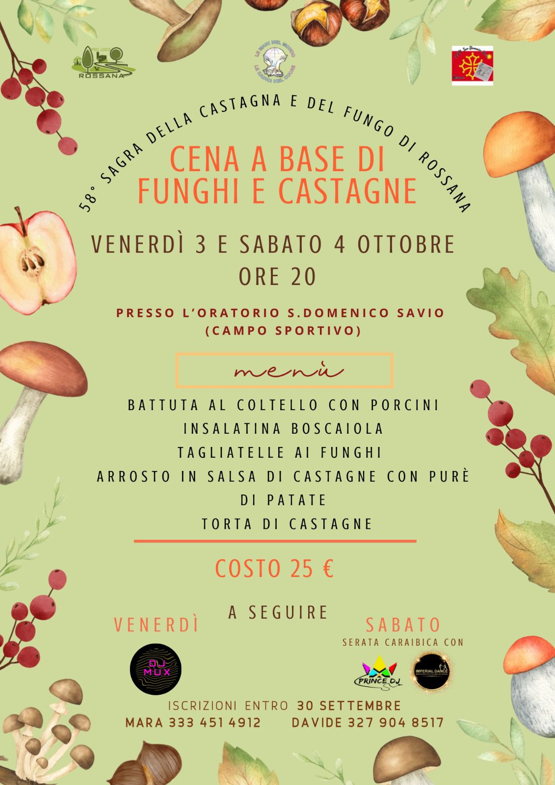 Si parte venerdì 3 ottobre con la Cena a base di funghi e castagne presso l’Oratorio San Domenico Savio. Gli ospiti potranno gustare piatti tipici preparati con ingredienti locali e genuini, esaltando i sapori autunnali. La serata continuerà con la musica di DJ Mux, creando un’atmosfera di festa e convivialità.
